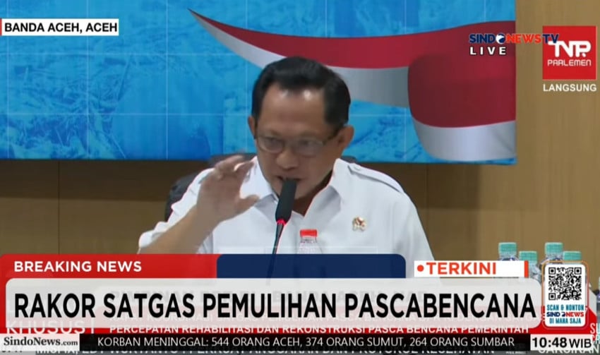 Menteri Dalam Negeri (Mendagri) Tito Karnavian meminta tambahan Bawah Kendali Operasi (BKO) dari TNI dan Polri sebanyak 5.000 personel guna mempercepat pembersihan lumpur pascabencana Sumatera. Foto/Tangkapan layar
