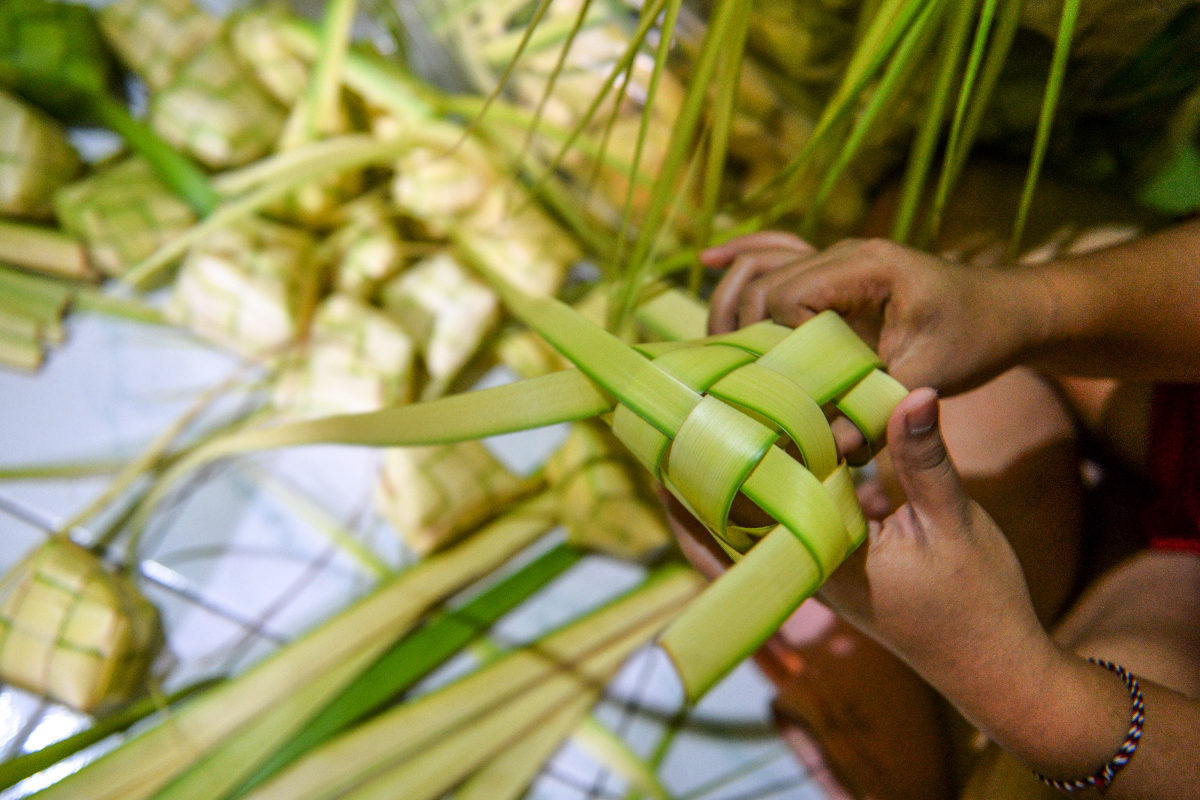 - Jika menggunakan daun kelapa, rajang dan bentuk menjadi anyaman ketupat.