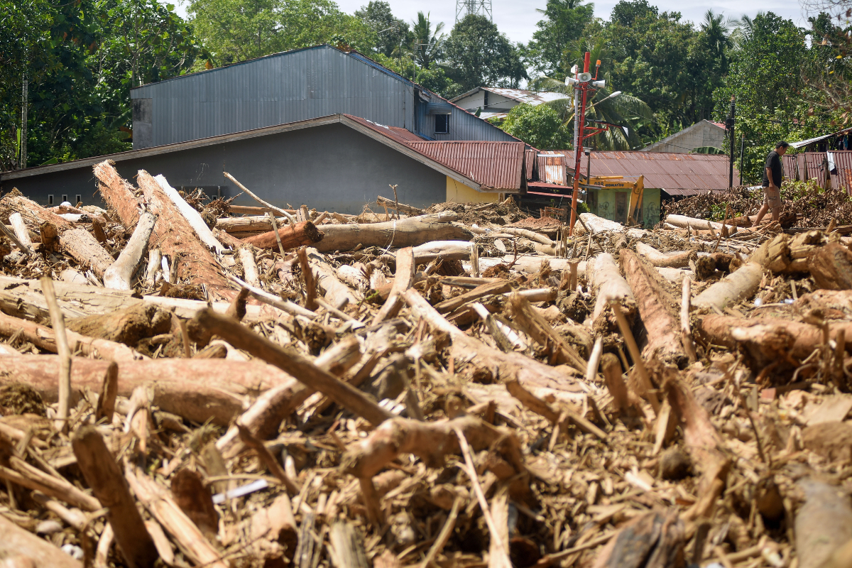 Warga melintas di antara tumpukan gelondongan kayu di permukiman di Tabiang Bandang Gadang, Nanggalo, Padang, Sumatera Barat.(ANTARA FOTO/Iggoy el Fitra)